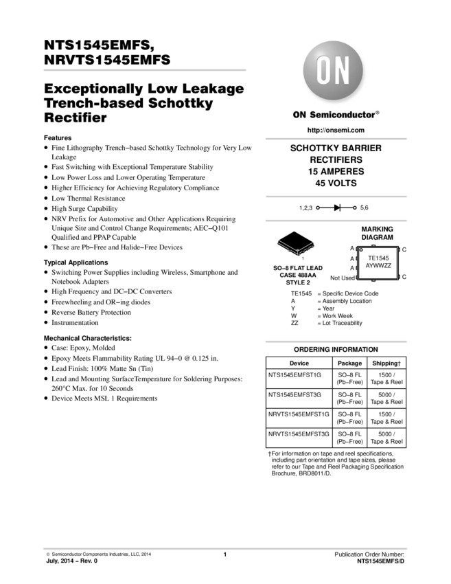 NRVTS1545EMFST1G Diode Schottky 45V 15A 8-Pin SO-FL T/R