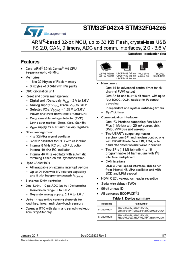 STM32F042K4U6, STM32F042K6U7, STM32F042K6T7, STM32F042C6U7, STM32F042K4T6, STM32F042G4U6, STM32F042K6U6