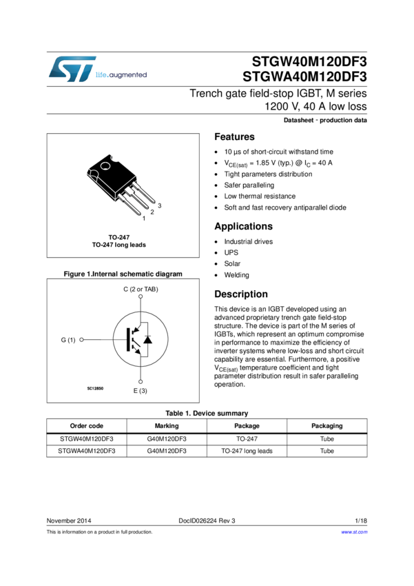 STGW40M120DF3 Trans IGBT Chip N-CH 1200V 80A 3-Pin TO-247 Tube