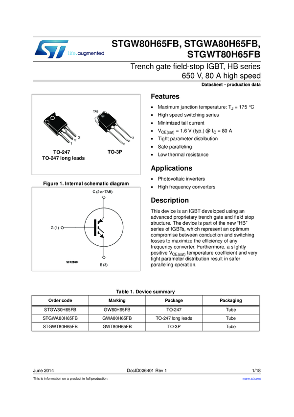 STGWA80H65FB Trans IGBT Chip N-CH 650V 120A 3-Pin TO-247 Tube
