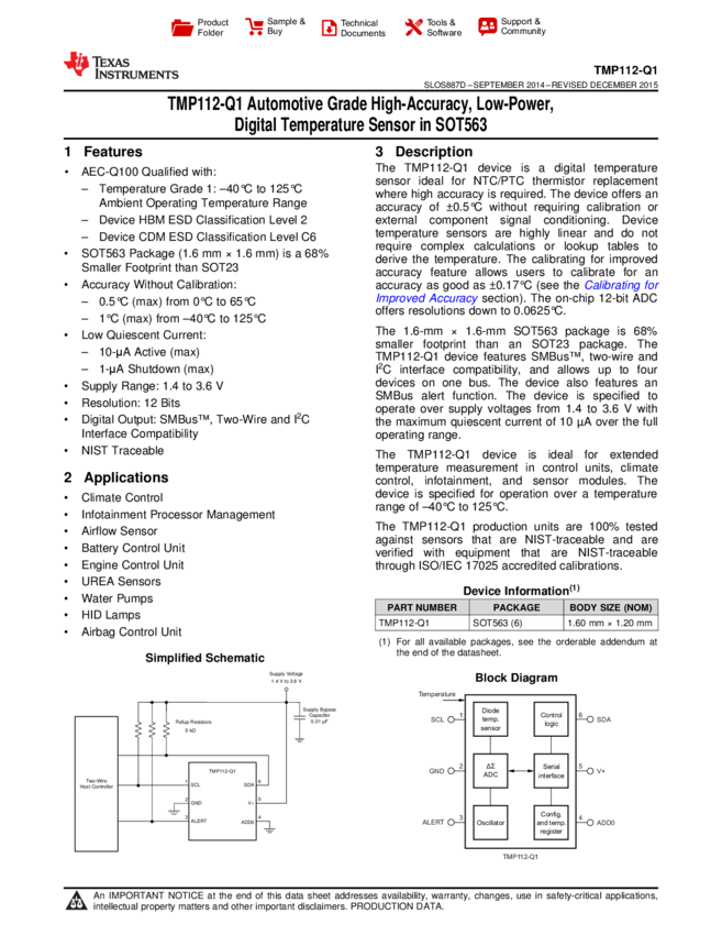 TMP112AQDRLRQ1 Temp Sensor Digital Serial (2-Wire, I2C) 6-Pin SOT-563 T/R