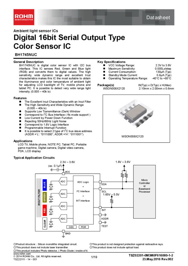 BH1745NUC-E2 Light to Digital Ambient Light Sensor Digital O/P 0.005lux to 40000lux 8-Pi...