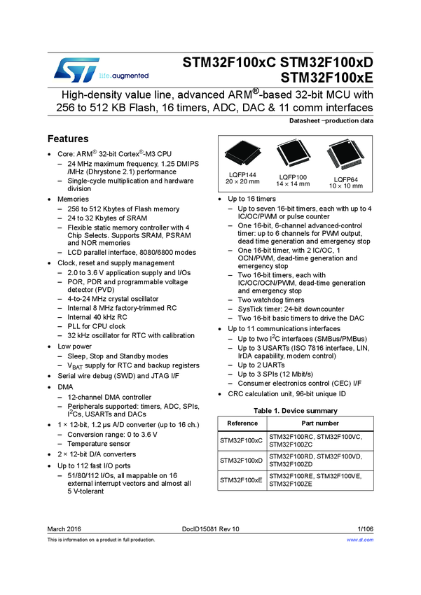 STM32F100RCT6 MCU 32-Bit STM32 ARM Cortex M3 RISC 256KB Flash 2.5V/3.3V 64-Pin LQFP Tray