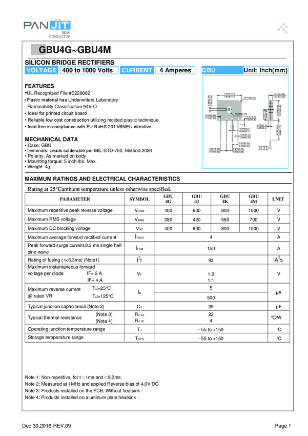 GBU4G_B0_10001 Diode Rectifier Bridge Single 400V 4A 4-Pin GBU Bulk