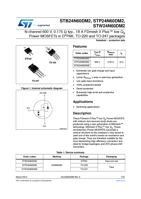 STB24N60DM2 Trans MOSFET N-CH 650V 18A 3-Pin D2PAK T/R