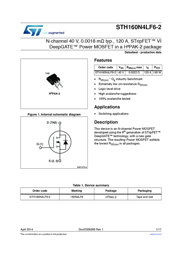 STH160N4LF6-2 Trans MOSFET N-CH 40V 120A 3-Pin H2PAK-2 T/R