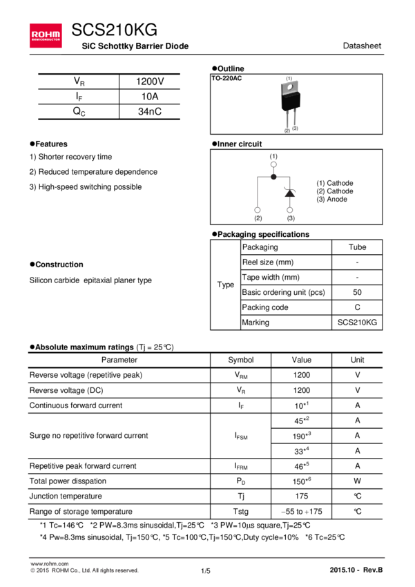 SCS210KGC SiC Schottky Barrier Diode 1.2KV 10A 2-Pin TO-220AC Tube