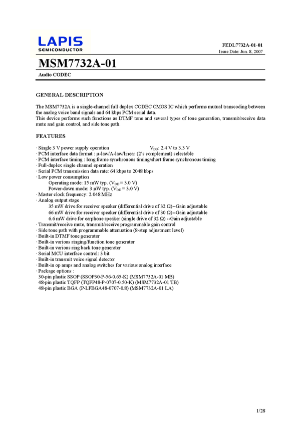 MSM7732A-01TBZ03A-7 Audio Codec 1ADC / 1DAC 48-Pin TQFP