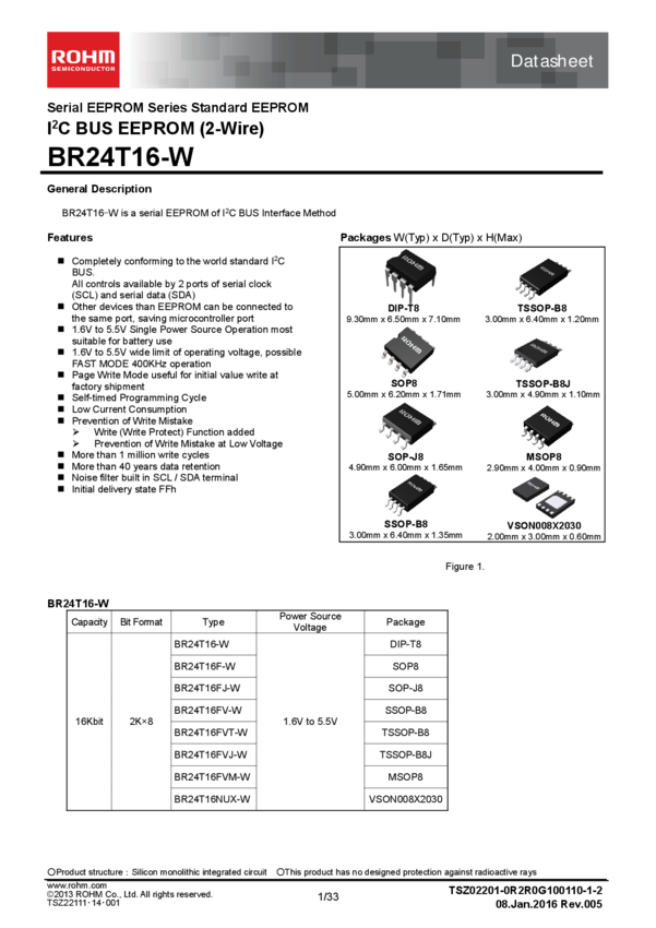BR24T16FJ-WBZGE2 EEPROM Serial-I2C 16K-bit 2K x 8 1.8V/5V 8-Pin SOP-J Embossed T/R