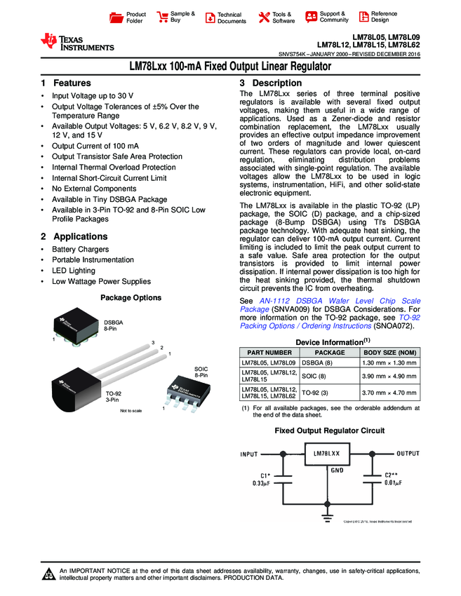 LM78L05ACM, LM78L12ACZ/NOPB, LM78L62ACZ/NOPB