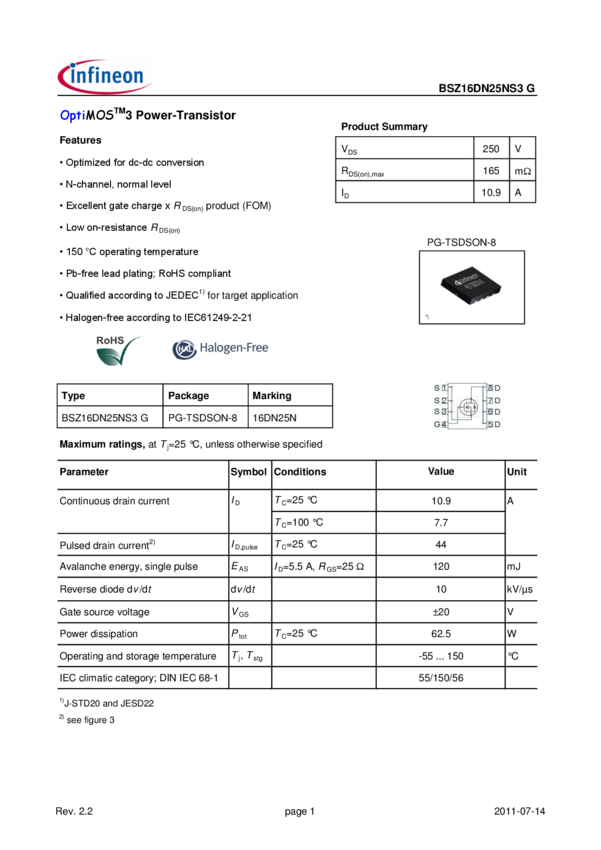 BSZ16DN25NS3GATMA1 Trans MOSFET N-CH 250V 10.9A 8-Pin TSDSON T/R