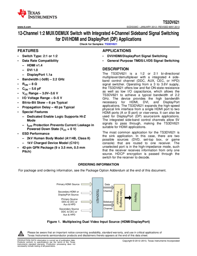 TS3DV621RUAR Analog Multiplexer Twelve 1:2 42-Pin WQFN EP T/R