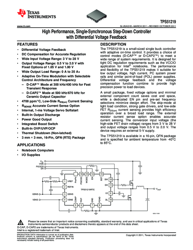 TPS51219RTET DC DC Cntrlr Single-OUT Sync Buck 3V to 28V Input 16-Pin WQFN EP T/R