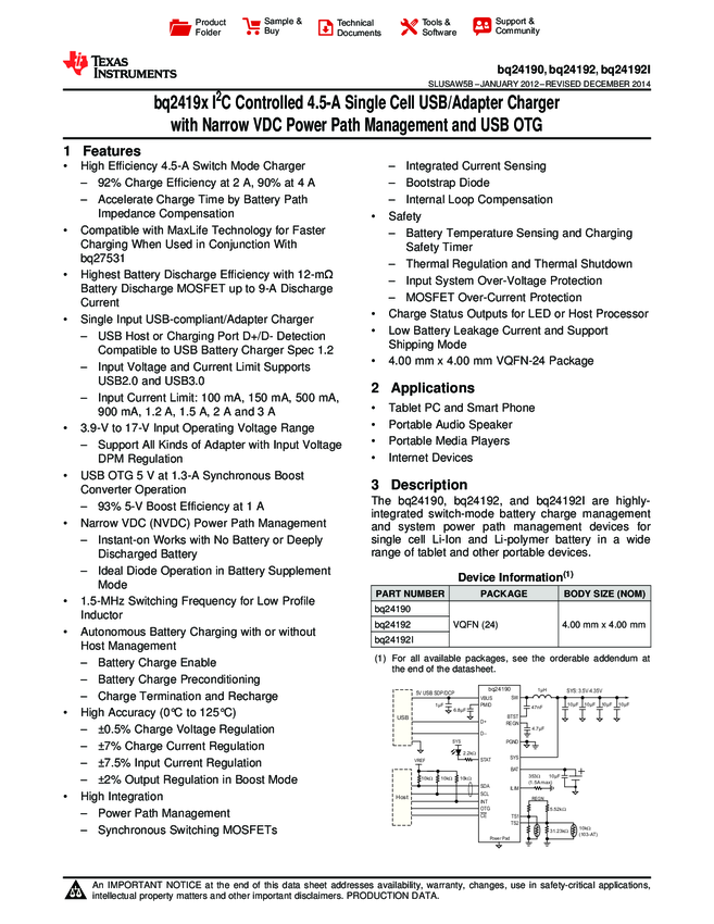 BQ24192RGET USB/AC Adapter Charger Li-Ion/Li-Pol 4.5mA 3.5V to 4.4V 24-Pin VQFN EP T/R