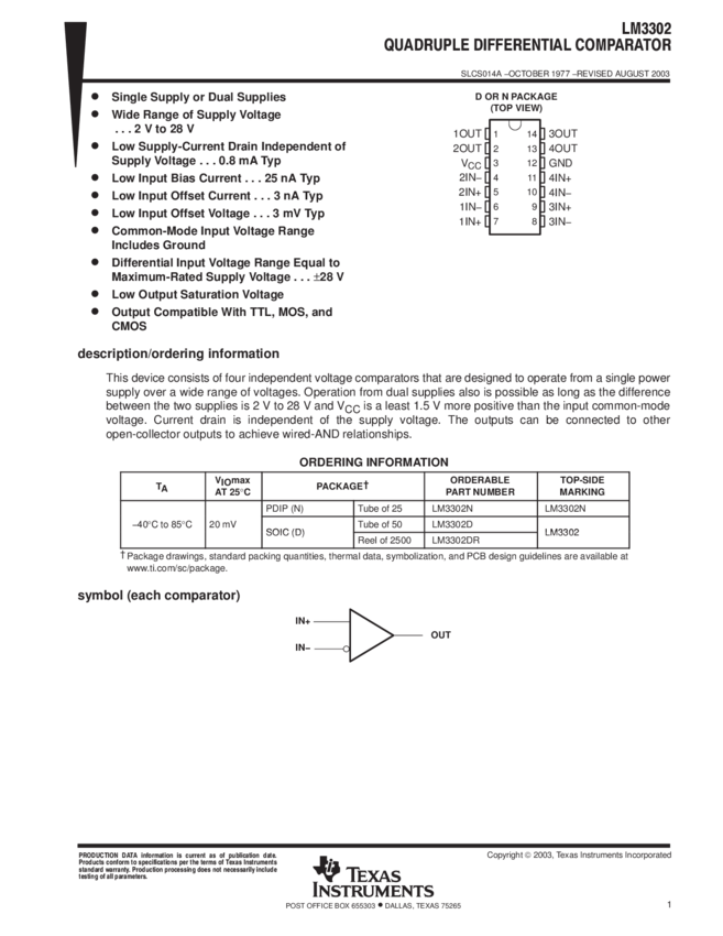 LM3302D Comparator Quad ±14V/28V 14-Pin SOIC Tube