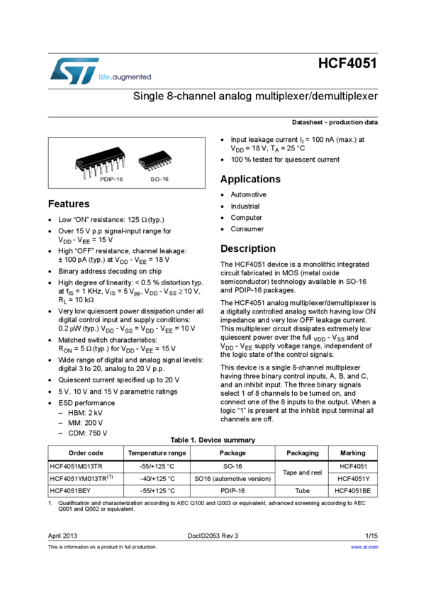 HCF4051YM013TR Analog Multiplexer Single 8:1 16-Pin SO T/R