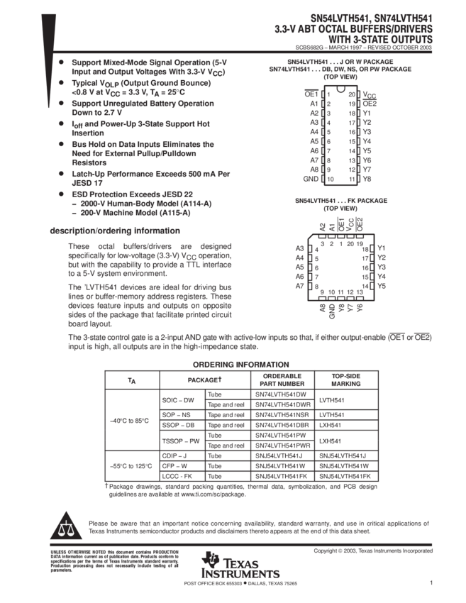 SN74LVTH541PWR Buffer/Line Driver 8-CH Non-Inverting 3-ST BiCMOS 20-Pin TSSOP T/R