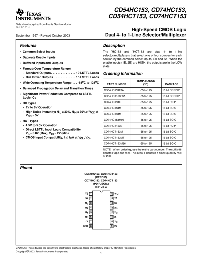 CD74HCT153E Multiplexer 1-Element CMOS 8-IN 16-Pin PDIP Tube