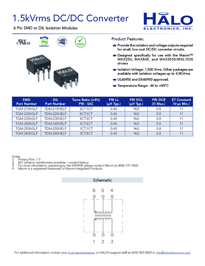 TGM-250NSRLTR Power Transformer 1500Vrms 1CT:1CT Dual Prim. Dual Sec. 3.3V/5V Sec. Surfac...