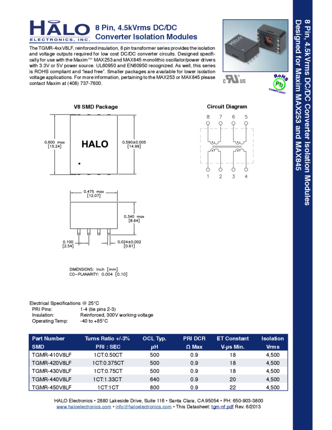 TGM-410NF Power Transformer 4500Vrms 2:1 Dual Prim. Dual Sec. 3.3V/5V Sec. Surface Mo...