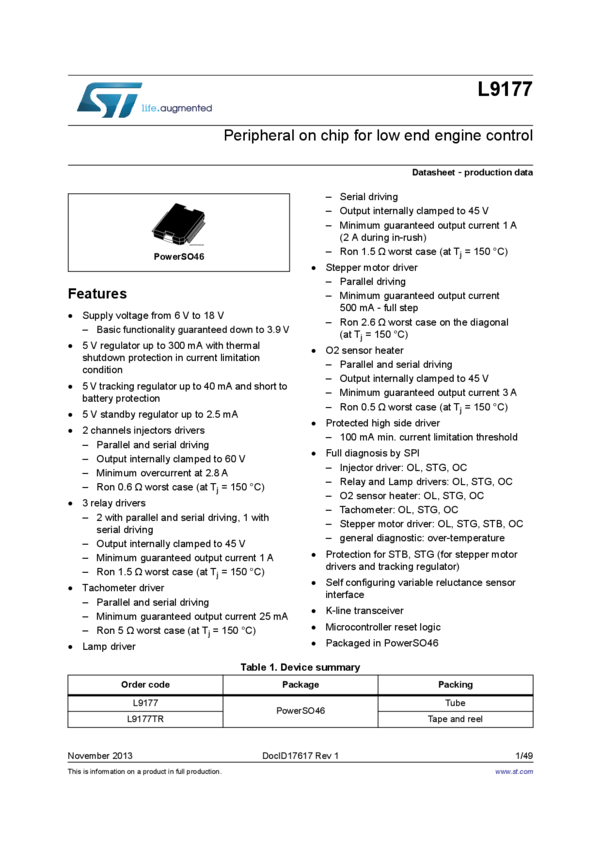 L9177 Peripheral On Chip For Low End Engine Control 46-PIN PowerSO Tube