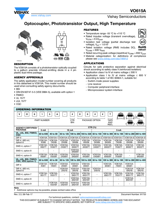 VO615A-1X019T Optocoupler DC-IN 1-CH DC-OUT 4-Pin SMD T/R