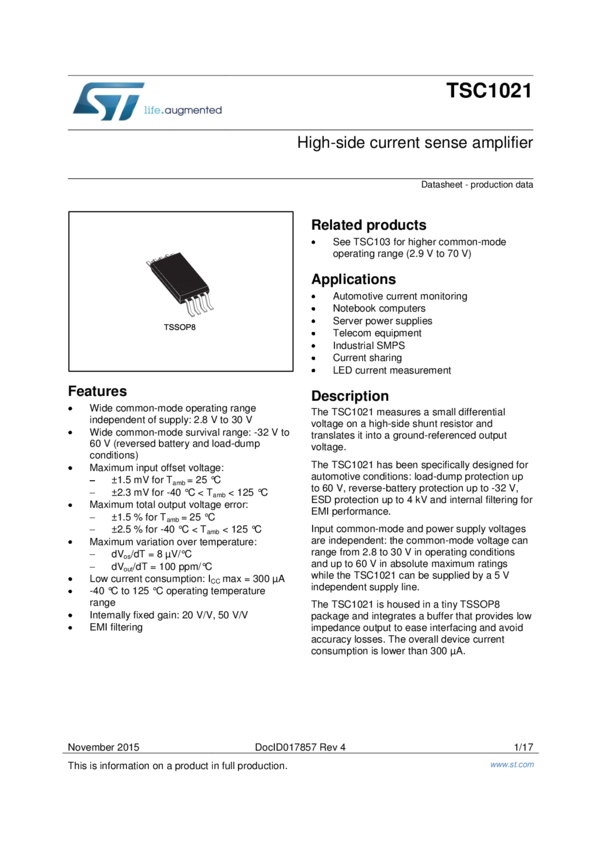 TSC1021AIYPT SP Amp Current Sense Amp Single 5.5V 8-Pin TSSOP T/R