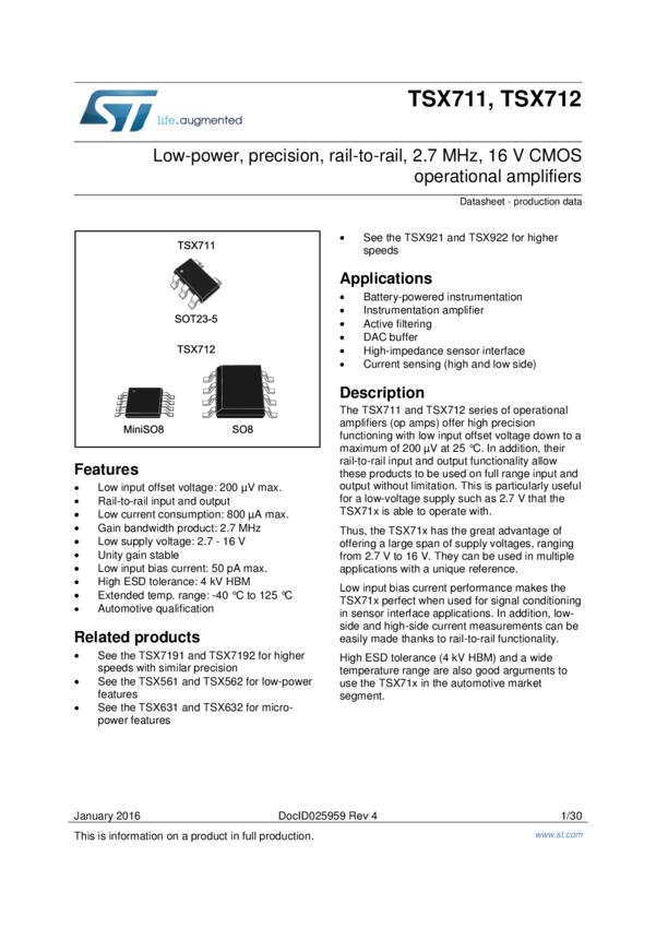 TSX711ILT OP Amp Single GP R-R I/O 16V 5-Pin SOT-23 T/R