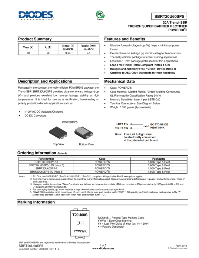 Diode Super Barrier Rectifier 60V 20A 3-Pin PowerDI 5 T/R