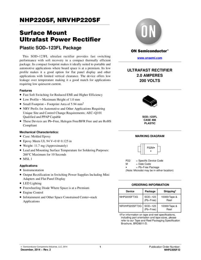 NHP220SFT3G Diode Ultra Fast Rectifier 200V 2A 2-Pin SOD-123 T/R