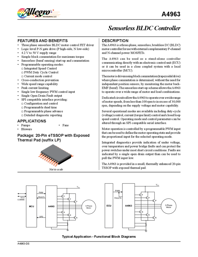 A4963GLPTR-T Brushless DC Motor Controller 4.2V to 50V 20-Pin TSSOP EP T/R
