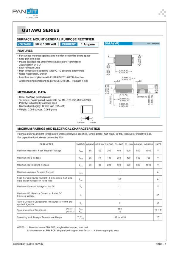 GS1MWG_R1_00001 Diode Rectifier 50V 1A 2-Pin SMA Plastic T/R