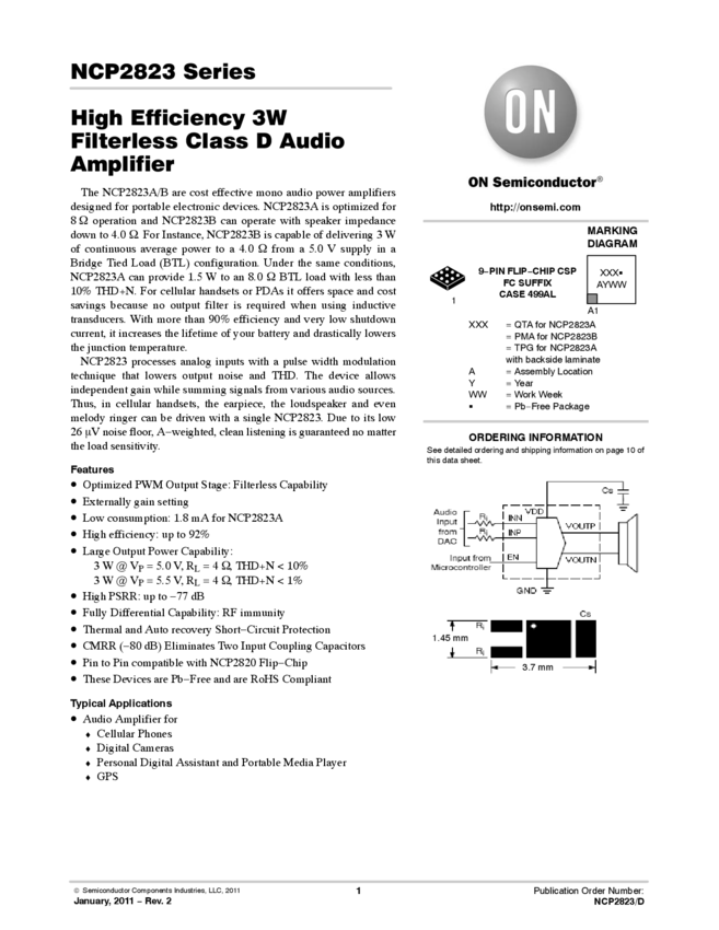 NCP2823BFCT1G Audio Amp Speaker 1-CH Mono 1.72W Class-D 9-Pin WLCSP T/R
