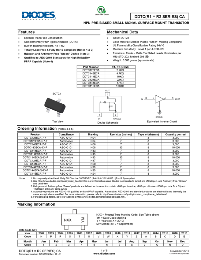 DDTC144ECAQ-7-F Trans Digital BJT NPN 50V 100mA 3-Pin SOT-23 T/R