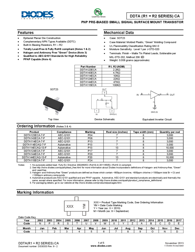 DDTA114ECAQ-7-F Trans Digital BJT PNP 50V 100mA 3-Pin SOT-23 T/R