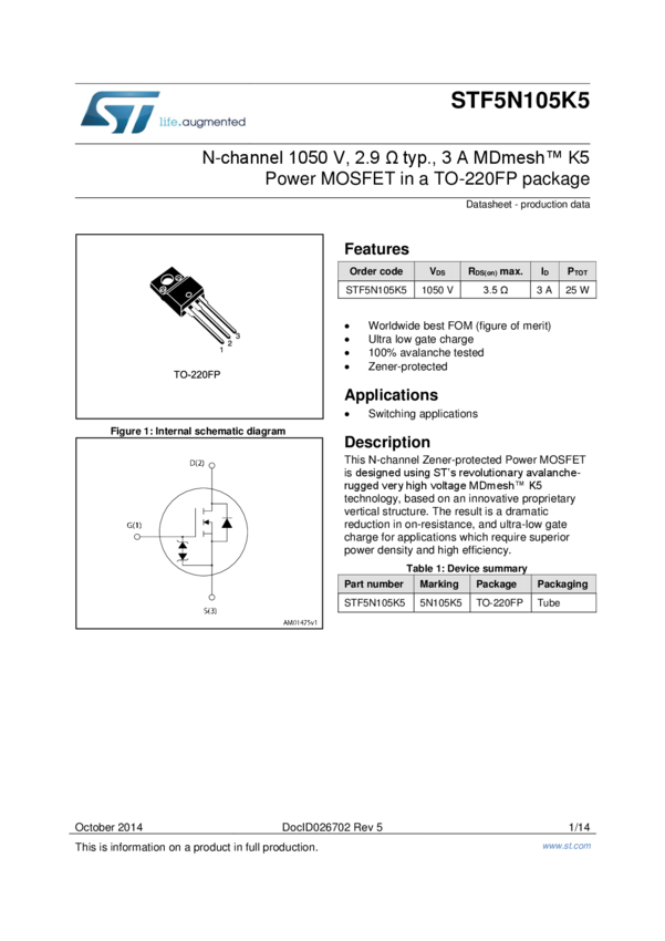 STF5N105K5 Trans MOSFET N-CH 1050V 3A 3-Pin TO-220 FP Tube
