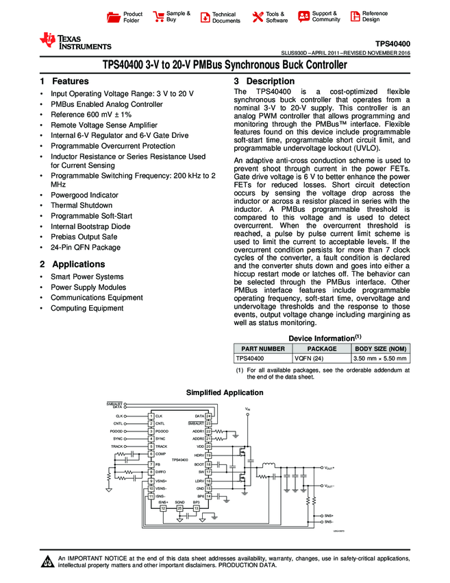 TPS40400RHLR Voltage Mode PWM Controller -0.3V to 30V 30mA 24-Pin VQFN EP T/R