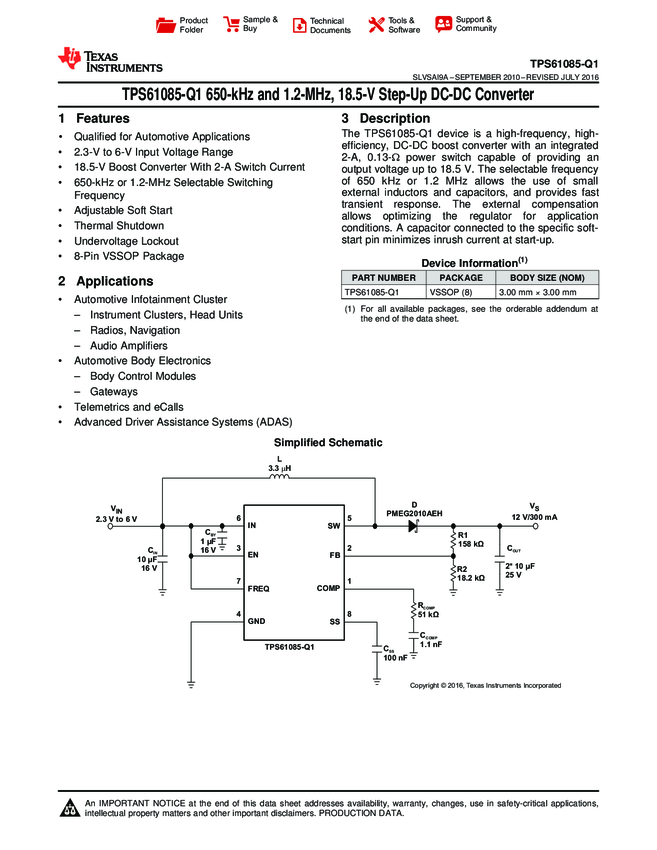 TPS61085TDGKRQ1 Conv DC-DC Single Step Up 2.3V to 6V 8-Pin VSSOP T/R