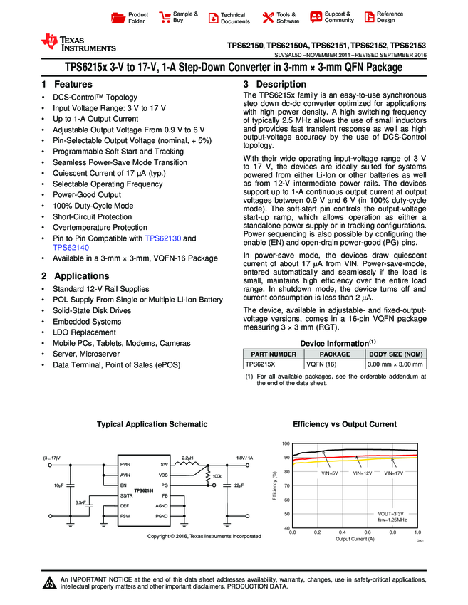 TPS62152RGTR Conv DC-DC Single Step Down 3V to 17V 16-Pin VQFN EP T/R