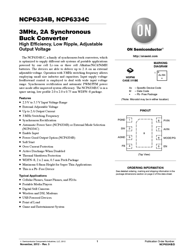NCP6334BMTAATBG Conv DC-DC Single Step Down 2.3V to 5.5V 8-Pin WDFN EP T/R