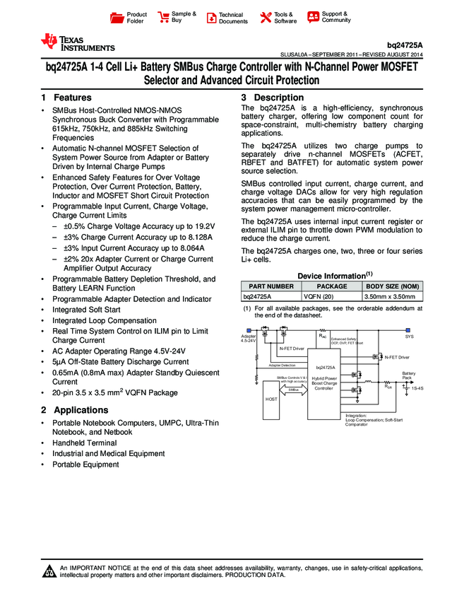 BQ24725ARGRR Battery Charger Li-Ion 8000mA 1V to 19V 20-Pin VQFN EP T/R