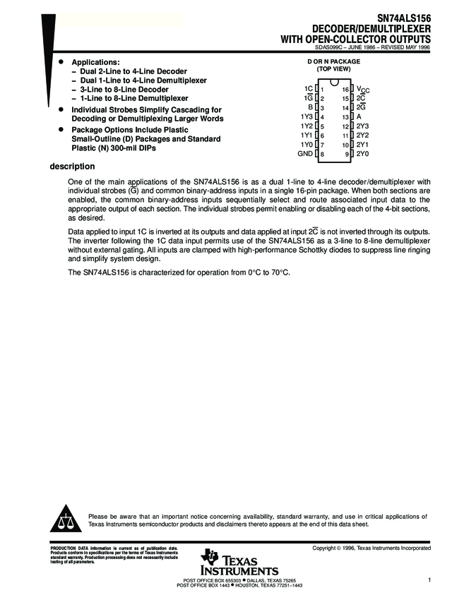 SN74ALS156N Decoder/Demultiplexer Single/Dual 3/2-to-8/4 16-Pin PDIP Tube