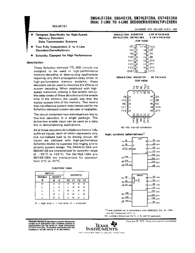 SN74LS139ADR Decoder/Demultiplexer Dual 2-to-4 16-Pin SOIC T/R