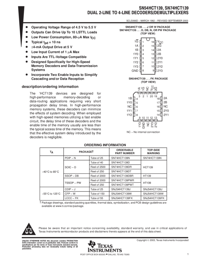 SN74HCT139N Decoder/Demultiplexer Dual 2-to-4 16-Pin PDIP Tube
