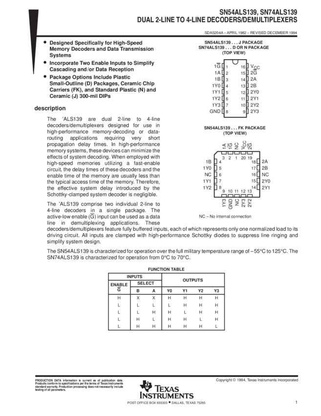 SN74ALS139N Decoder/Demultiplexer Dual 2-to-4 16-Pin PDIP Tube