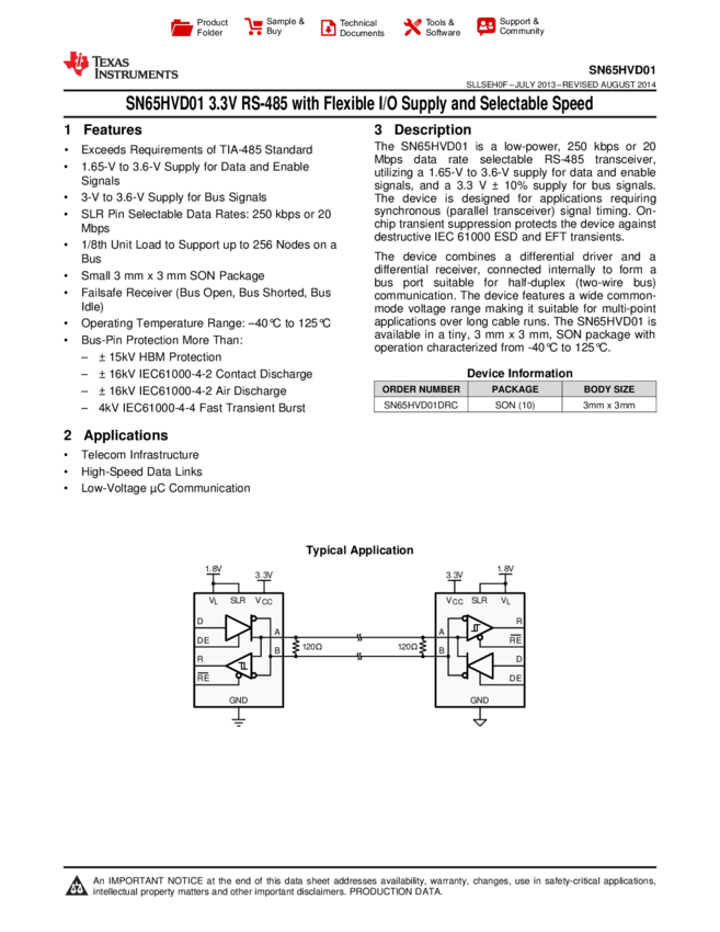 SN65HVD01DRCT Single Line Transceiver RS-485 10-Pin VSON EP T/R