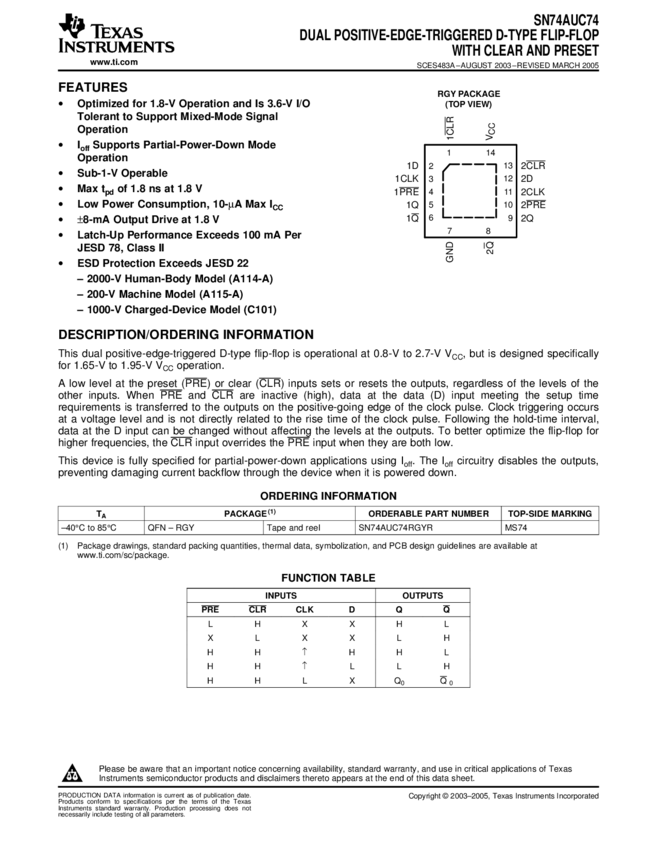 SN74AUC74RGYR Flip Flop D-Type Pos-Edge 2-Element 14-Pin VQFN EP T/R