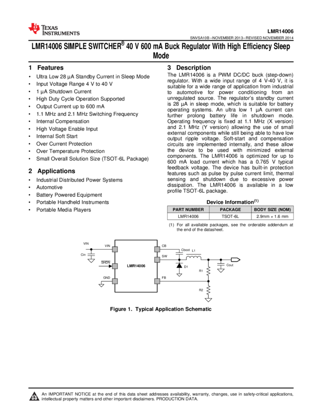 LMR14006YDDCR Conv DC-DC 1-OUT Step Down 4V 40V 6-Pin SOT T/R