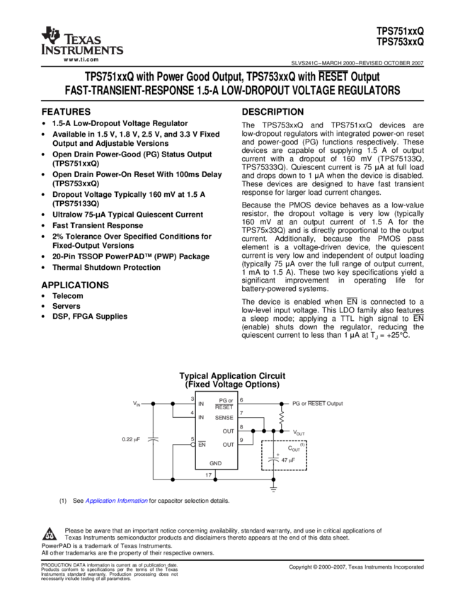 TPS75333QPWPR LDO Regulator Pos 3.3V 1.5A 20-Pin HTSSOP EP T/R
