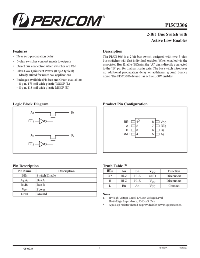 PI5C3306LX Bus Switch 2-Element CMOS 2-IN 8-Pin TSSOP T/R